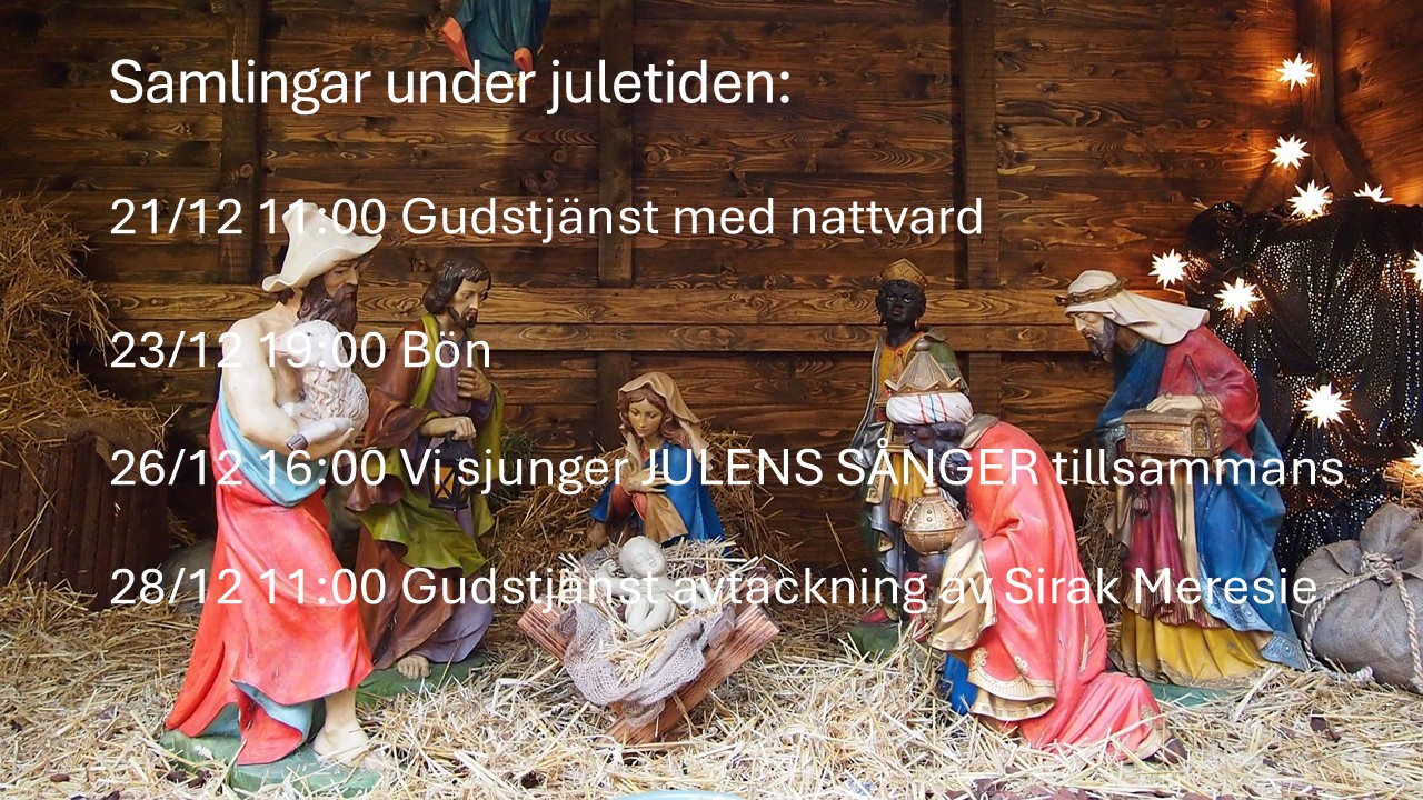 Vi vill vara en öppen kyrka för alla och är glada att du hittat hit. Vi är en församling som består av människor i olika åldrar och med bakgrund från flera olika länder och du är välkommen till oss. I vår kalender kan du se det som händer i vår kyrka och du är välkommen! Du får gärna ta kontakt med oss via telefon och email (se under kontakt) så återkommer vi till dig.